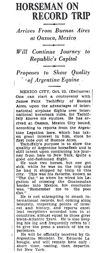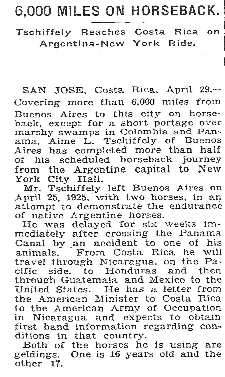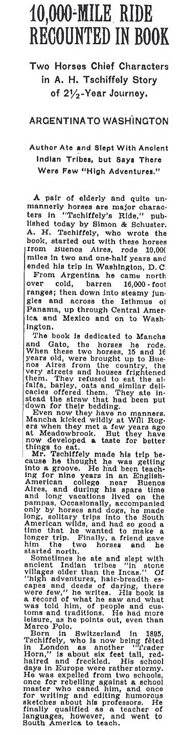 article about Tschiffely’s journey from Buenos Aires to New York. This